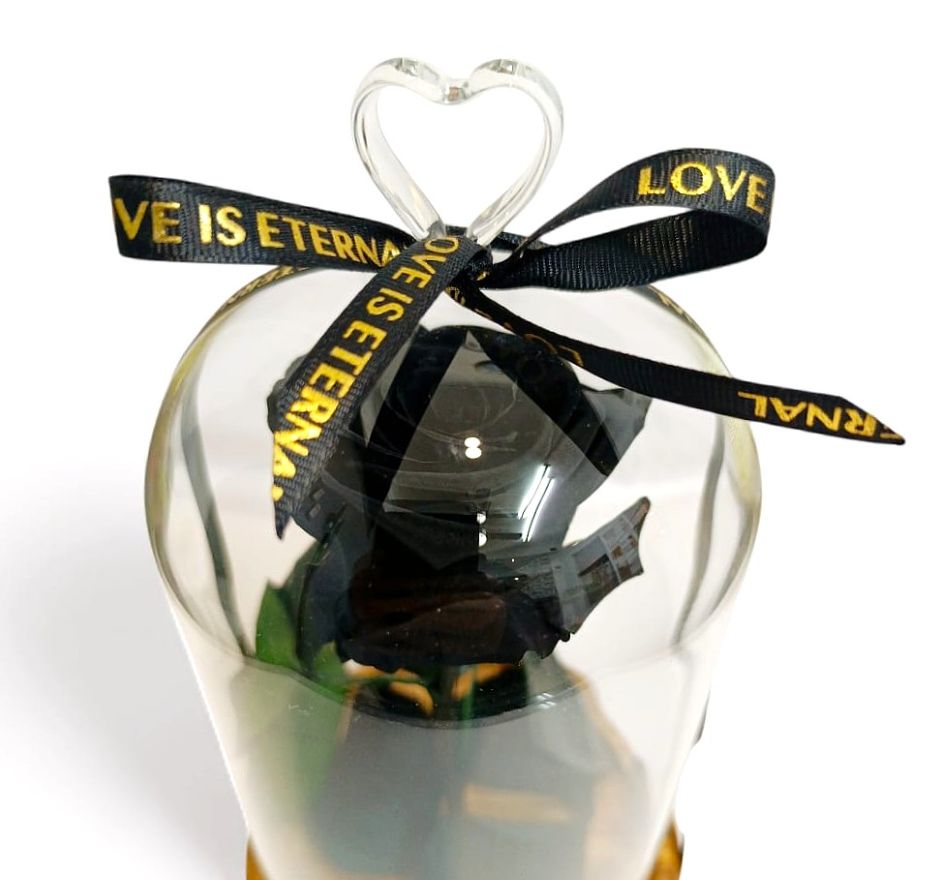 Cúpula de cristal con rosa negra preservada (eterna). Regalo exclusivo para la persona que sabe apreciar la elegancia de rosa negra. Inscripción en la base «Love Is Eternal» . Alta durabilidad gracias al tratamiento que recibe la rosa natural. Altura cúpula aprox. 25 cm.